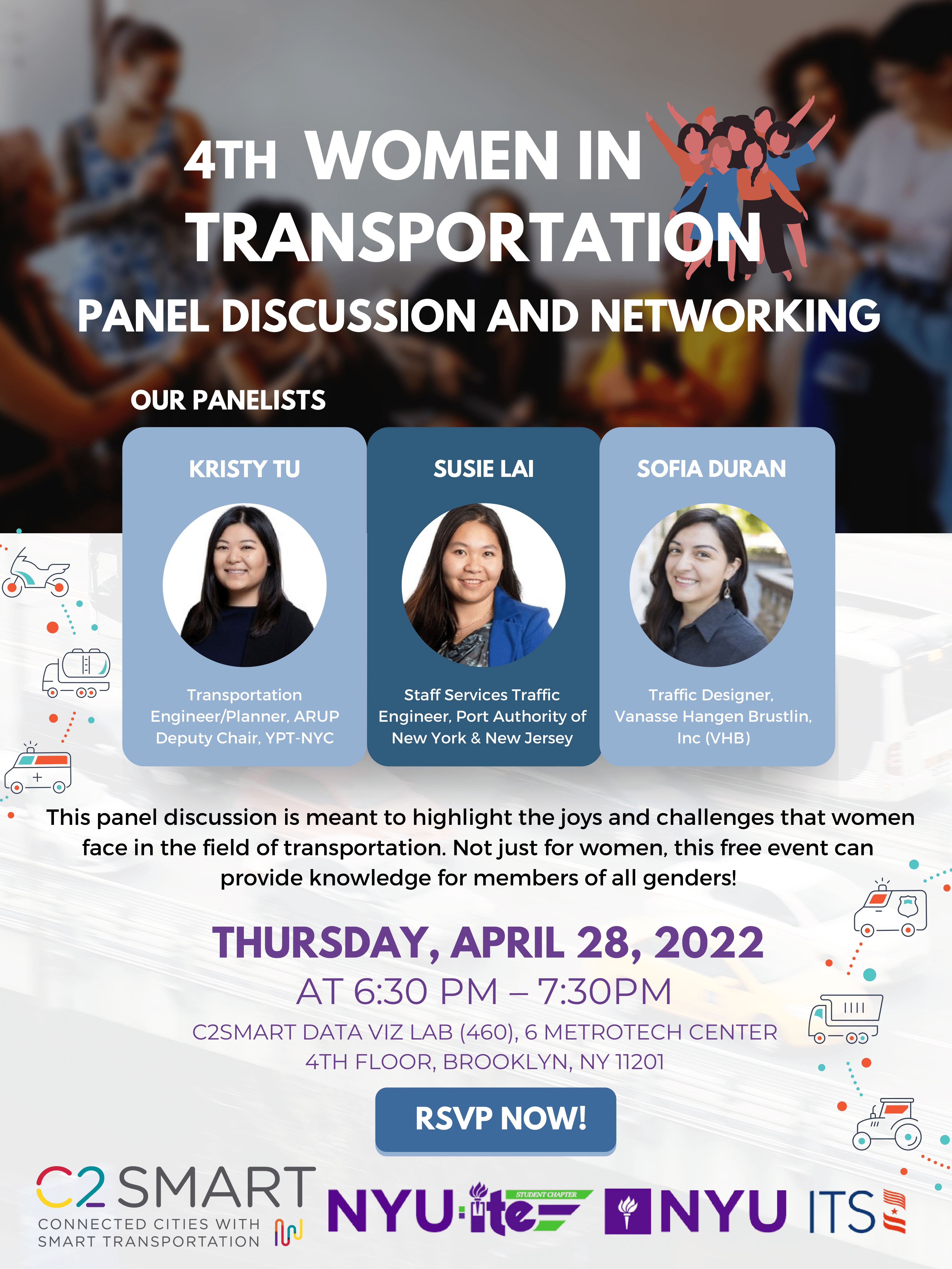 The C2SMART Center and the NYU chapter of the Institute of Transportation Engineers (ITE) are excited to host our annual Women in Transportation Panel Discussion, followed by an opportunity for attendees to network and socialize. This year’s panel boasts three amazing women working in the transportation industry who will share their perspectives and experiences.